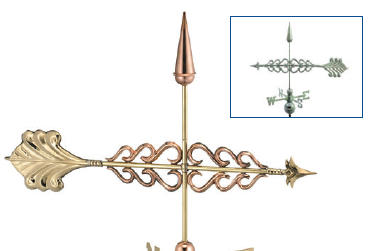 Copper and blue verdegrass weathervanes are an elegant addition to any roof. The Arrow Weathervane dimensions are 33.5L x 22.5H.